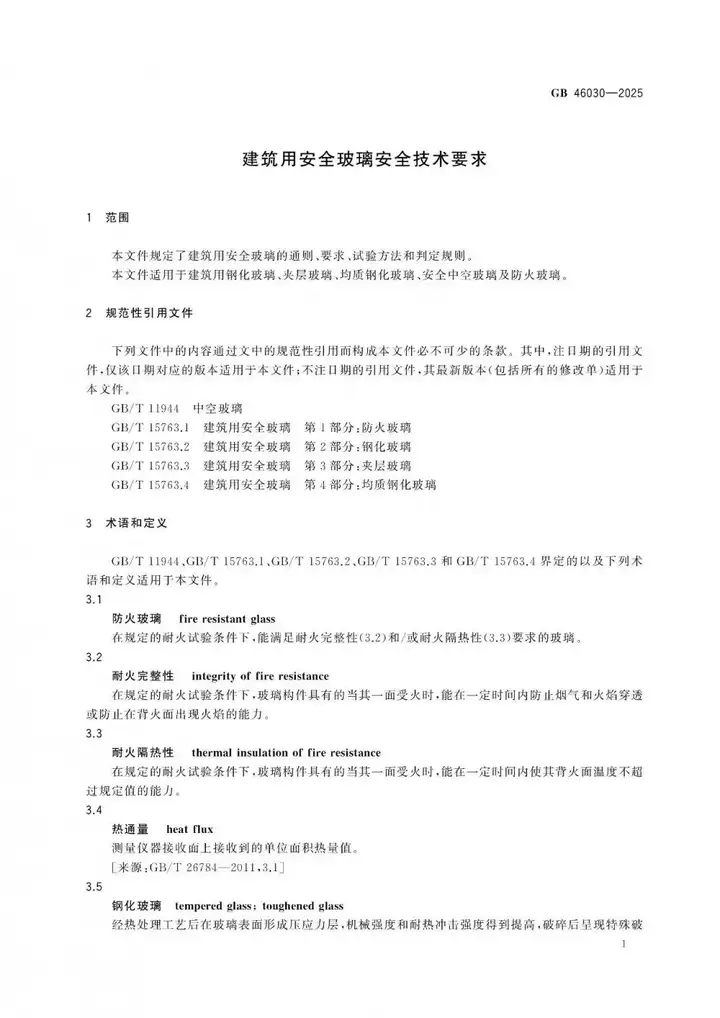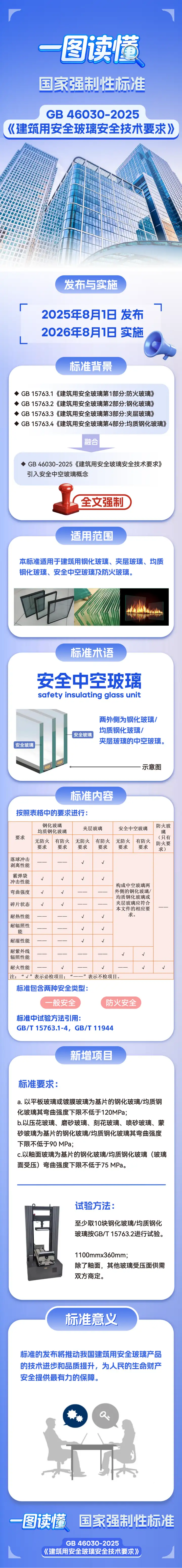 8月,国家市场监督管理总局与国家标准化管理委员会正式发布强制性国家标准《建筑用安全玻璃安全技术要求》(GB 46030—2025),该标准将于2026年8月1日起正式实施,新标准适用于建筑用钢化玻璃、夹层玻璃、均质钢化玻璃、安全中空玻璃及防火玻璃,覆盖了主流安全玻璃类型。